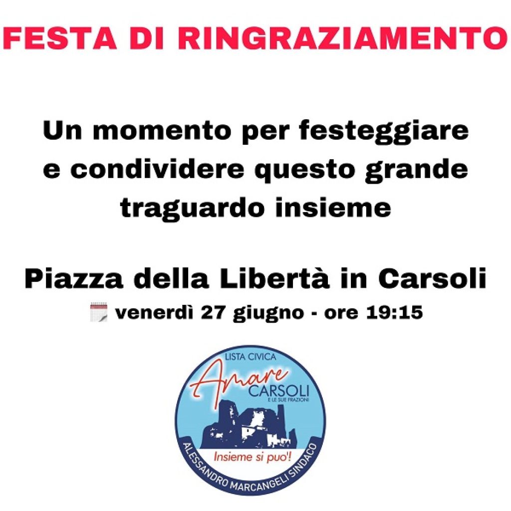 Redazione- Domani venerdì 27 giugno alle ore 19:15 in Piazza della Libertà, Uun grande appuntamento per festeggiare insieme la vittoria elettorale della lista Amare Carsoli con Alessandro Marcangeli sindaco.
