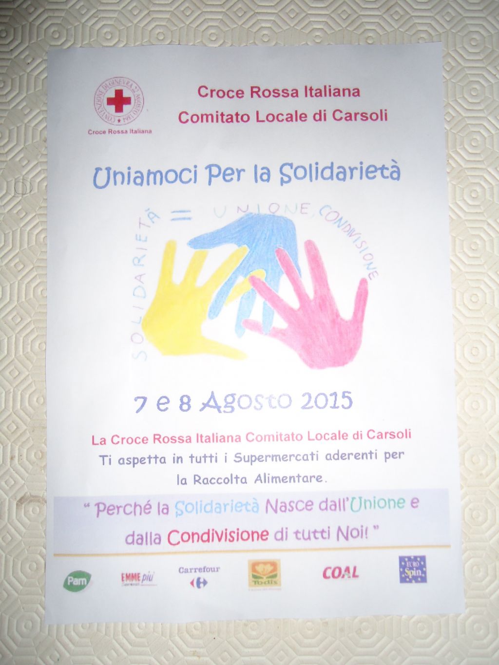 Carsoli-Venerdì 7 Agosto (solo pomeriggio) e sabato 8 Agosto (intera giornata), la Croce Rossa Italiana di Carsoli ha indetto la "Giornata della solidarietà". Con il bel disegno fatto dall'alunna Giada Di Napoli, che invita tutti a darsi la mano, facciamo sì che donando ciascunouna piccola cosa, contribuiamo a "colorare" le nostre mani di amicizia e fraternità.Gli alimenti che saranno raccolti, serviranno per i bisogni dei nostri assistiti.Sappiamo di chiedere molto per il periodo difficile che l'Italia sta attraversando, però un piccolo gesto può fare la differenza: persone che non hanno di che mangiare, potranno farlo grazie a voi.(di Annamaria Massimi)