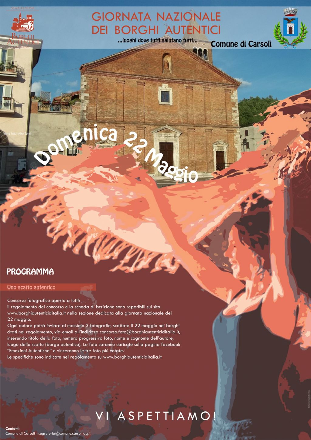 Carsoli-In occasione della " 1° Giornata Nazionale Borghi Autentici" promossa dall'Associazione Borghi Autentici d'Italia in collaborazione con i borghi partecipanti, il Comune di Carsoli ha aderito al concorso fotografico "Uno scatto autentico".L'obiettivo dell'iniziativa è quello di valorizzare, mediante le foto, l'autenticità e l'identità che caratterizzano i nostri borghi attraverso dettagli artistici ed architettonici, scene di vita quotidiana tra le vie, atmosfere, scorci e suggestioni.La partecipazione al concorso è gratuita e aperta a tutti, professionisti e amatori. Le iscrizioni sono aperte sino al 24 maggio.Le foto dovranno essere scattate esclusivamente durante la Giornata Nazionale del 22 Maggio.In palio un week end a scelta per due persone in un borgo autentico.Per il regolamento e il modulo d'iscrizione: