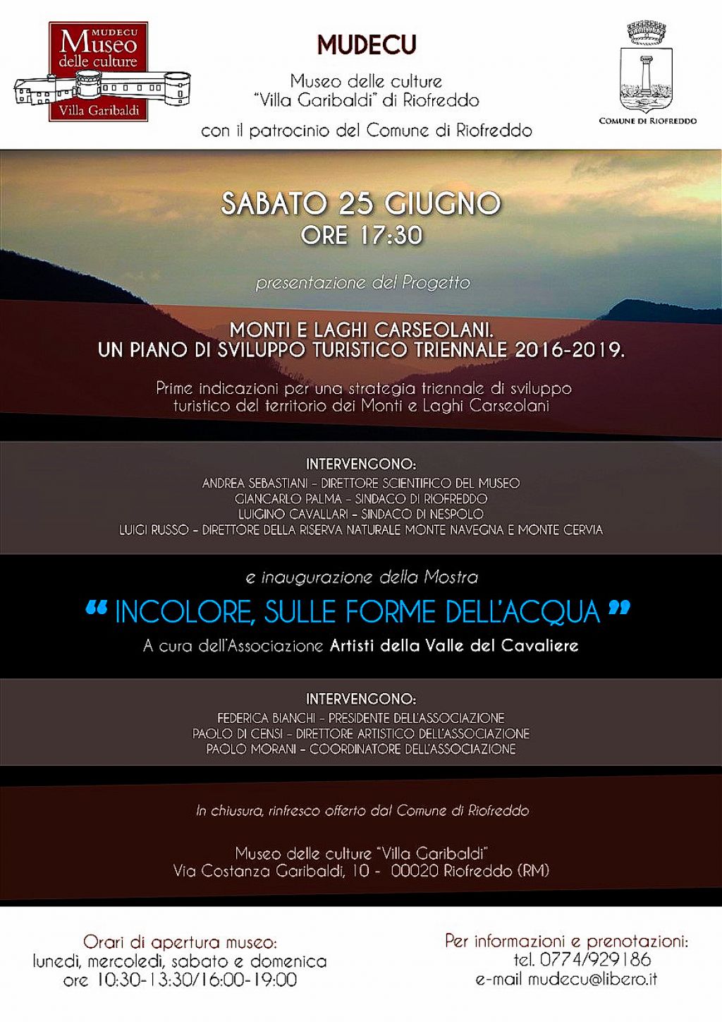 RIOFREDDO, SABATO 25 GIUGNO PRESENTAZIONE DEL PROGETTO"MONTI E LAGHI CARSEOLANI. UN PIANO DI SVILUPPO TRIENNALE 2016-2019"