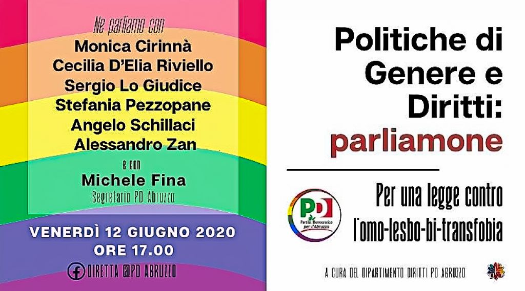 Redazione- “Politiche di Genere e Diritti: parliamone” è il titolo dell’incontro a cura del Dipartimento Politiche di Genere e Diritti del Partito Democratico abruzzese, che si svolgerà domani venerdì 12 giugno alle 17 in diretta Facebook. L’incontro sarà incentrato sull’ampio tema politico dei diritti civili a quattro anni della legge 76/2016 e sulle prospettive di integrazione in attesa della legge contro le discriminazioni.Il PD Abruzzo, attraverso il dipartimento citato, vuole avviare un laboratorio politico di temi, idee, istanze, riflessioni e soprattutto ascolto delle associazioni che operano nel territorio su questi temi. All’incontro di domani parteciperanno, oltre al segretario regionale del Pd Michele Fina, la deputata Stefania Pezzopane, la senatrice Monica Cirinnà, Cecilia D’Elia Riviello, Sergio Lo Giudice, Angelo Schillaci, Alessandro Zan e i rappresentanti delle associazioni. Sarà il primo di una serie di incontri all’inizio di questo inaspettato Giugno Pride, ribadendo che
