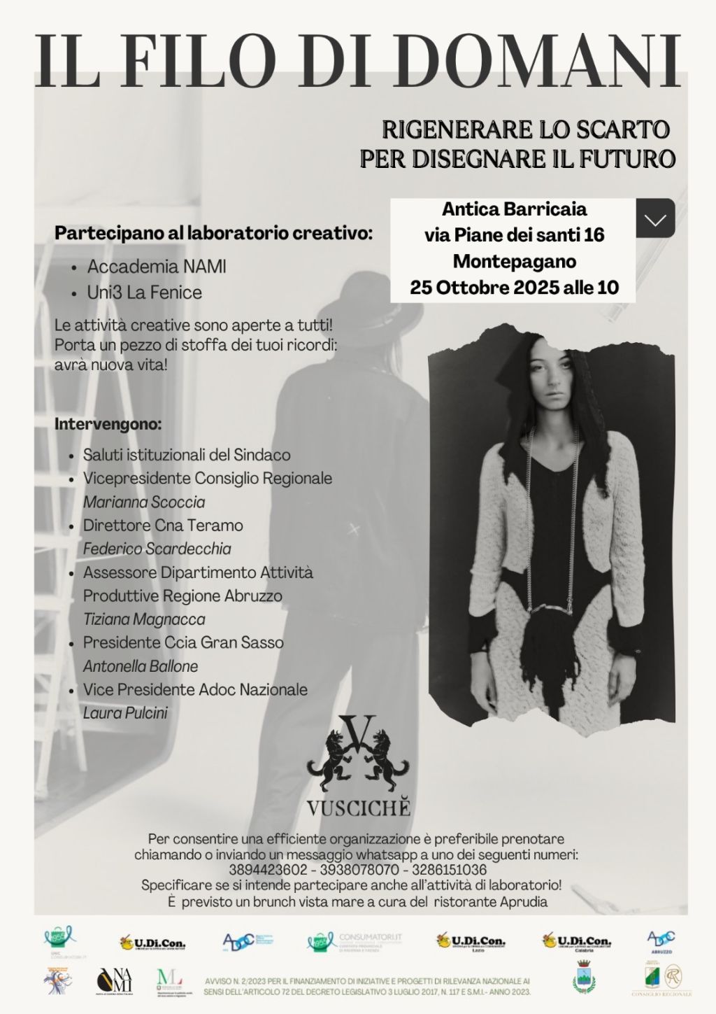 Redazione- DOMANI, 25 ottobre, alle ore 10.00, nell’antica barricaia del borgo di Montepagano, Roseto degli Abruzzi, si terrà l’evento immersivo “Il Filo di domani. Rigenerare lo scarto per disegnare il futuro”, organizzato da Adoc Abruzzo, nell’ambito del progetto nazionale “CirCe – Circular Energy & Circular Economy, con lo scopo di dibattere, toccare con mano e partecipare all’economia circolare.