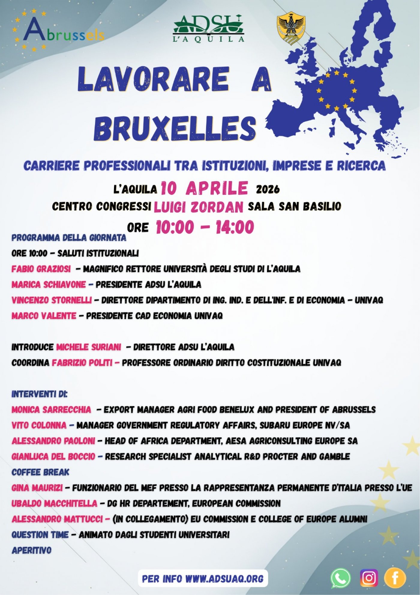 Così la presidente dell’associazione “Abrussels”, Monica Sarrecchia, spiegando il senso dell’evento organizzato dall’Azienda per il diritto agli studi (Adsu), dedicato alle opportunità di carriera nelle istituzioni Ue. L’iniziativa, dal titolo “Lavorare a Bruxelles – Carriere professionali tra istituzioni, imprese e ricerca”, si terrà dalle 10 alle 14 al Centro congressi “Luigi Zordan”. L’evento è promosso da Adsu L’Aquila, in collaborazione con l’Università degli Studi dell’Aquila e con l’associazione ‘Abrussels’.